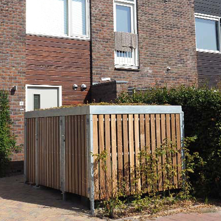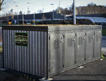 Cykelboxen kan kläs i en mängd olika material och utrustas med alla tänkbara låsvarianter. Det är även möjligt att förse boxen med sedumtak för odling.